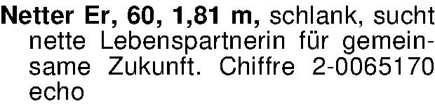 Netter Er, 60, 1,81 m, schlank, sucht nette Lebenspartnerin für gemeinsame Zukunft. Chiffre 2-0065170 echo