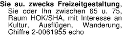 Langeweile? Lustige Single-Freizeitgruppe (55 – 65) mit Frauenüberschuss sucht für vielseit. Unternehmungen junggebl. männl. Verstärkung (Raum HN). sk61nh@gmail. com oder Chiffre 2-0064229 echo