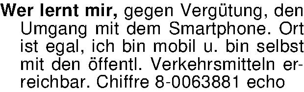 Wer lernt mir, gegen Vergütung, den Umgang mit dem Smartphone. Ort ist egal, ich bin mobil u. bin selbst mit den öffentl. Verkehrsmitteln erreichbar. Chiffre 8-0063881 echo