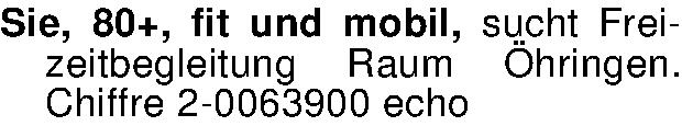 Sie, 80+, fit und mobil, sucht Freizeitbegleitung Raum Öhringen. Chiffre 2-0063900 echo