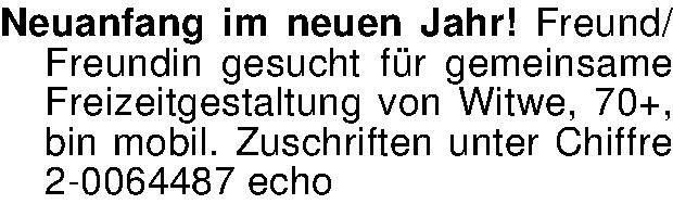 Neuanfang im neuen Jahr! Freund/Freundin gesucht für gemeinsame Freizeitgestaltung von Witwe, 70+, bin mobil. Zuschriften unter Chiffre 2-0064487 echo
