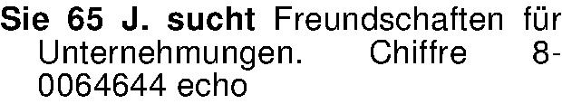 Sie 65 J. sucht Freundschaften für Unternehmungen. Chiffre 8-0064644 echo