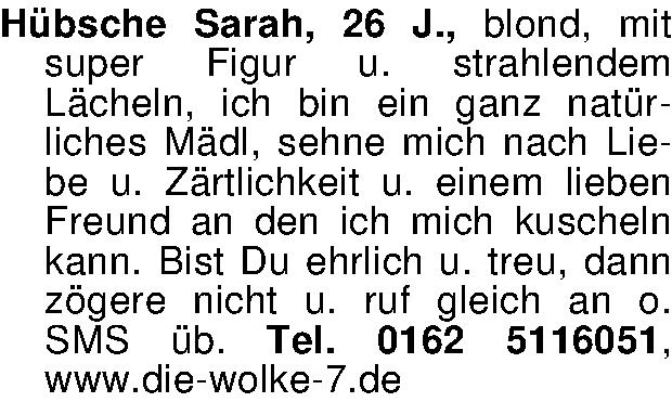 Hübsche Sarah, 26 J., blond, mit super Figur u. strahlendem Lächeln, ich bin ein ganz natürliches Mädl, sehne mich nach Liebe u. Zärtlichkeit u. einem lieben Freund an den ich mich kuscheln kann. Bist Du ehrlich u. treu, dann zögere nicht u. ruf gleich an o. SMS üb. Tel. 0162 5116051,