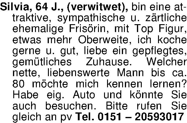 Silvia, 64 J., (verwitwet), bin eine attraktive, sympathische u. zärtliche ehemalige Frisörin, mit Top Figur, etwas mehr Oberweite, ich koche gerne u. gut, liebe ein gepflegtes, gemütliches Zuhause. Welcher nette, liebenswerte Mann bis ca. 80 möchte mich kennen lernen? Habe eig. Auto und könnte Sie auch besuchen. Bitte rufen Sie gleich an pv Tel. 0151 – 20593017