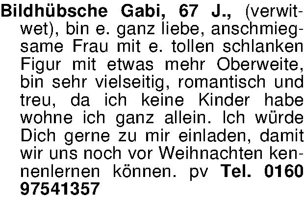 Bildhübsche Gabi, 67 J., (verwitwet), bin e. ganz liebe, anschmiegsame Frau mit e. tollen schlanken Figur mit etwas mehr Oberweite, bin sehr vielseitig, romantisch und treu, da ich keine Kinder habe wohne ich ganz allein. Ich würde Dich gerne zu mir einladen, damit wir uns noch vor Weihnachten kennenlernen können. pv Tel. 0160 97541357