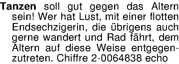 Tanzen soll gut gegen das Altern sein! Wer hat Lust, mit einer flotten Endsechzigerin, die übrigens auch gerne wandert und Rad fährt, dem Altern auf diese Weise entgegenzutreten. Chiffre 2-0064838 echo