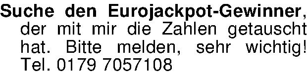 Suche den Eurojackpot-Gewinner, der mit mir die Zahlen getauscht hat. Bitte melden, sehr wichtig! Tel. 0179 7057108
