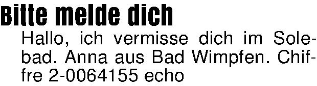 Bitte melde dich Hallo, ich vermisse dich im Solebad. Anna aus Bad Wimpfen. Chiffre 2-0064155 echo