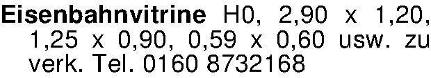 Eisenbahnvitrine H0, 2,90 x 1,20, 1,25 x 0,90, 0,59 x 0,60 usw. zu verk. Tel. 0160 8732168