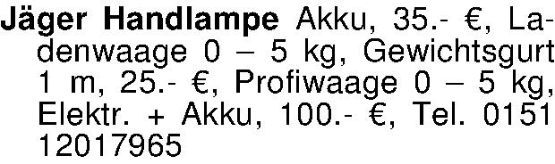 Jäger Handlampe Akku, 35.- €, Ladenwaage 0 – 5 kg, Gewichtsgurt 1 m, 25.- €, Profiwaage 0 – 5 kg, Elektr. + Akku, 100.- €, Tel. 0151 12017965
