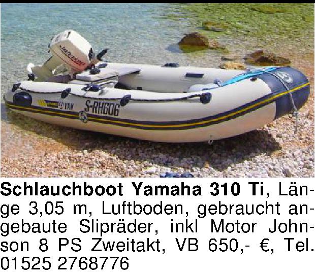 Schlauchboot Yamaha 310 Ti, Länge 3,05 m, Luftboden, gebraucht angebaute Slipräder, inkl Motor Johnson 8 PS Zweitakt, VB 650,- €, Tel. 01525 2768776