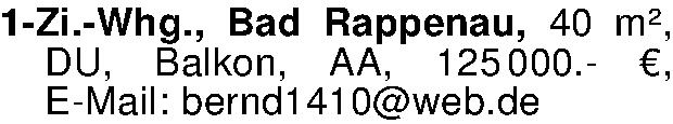 Anzeigentitel: 1-Zi.-Whg., Bad Rappenau, 40 m², DU, Balkon, AA, 125 000.- €
