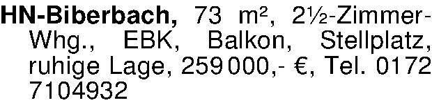 HN-Biberbach, 73 m², 2½-Zimmer-Whg., EBK, Balkon, Stellplatz, ­ruhige Lage, 259 000,- €, Tel. 0172 7104932