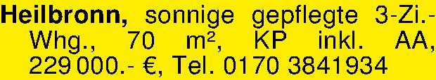 Heilbronn, sonnige gepflegte 3-Zi.-Whg., 70 m², KP inkl. AA, 229 000.- €, Tel. 0170 3841934