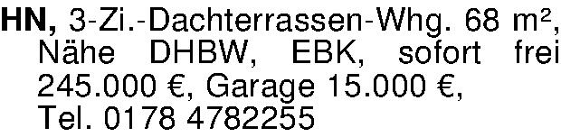 Anzeigentitel: HN, 3-Zi.-Dachterrassen-Whg. 68 m², Nähe DHBW, EBK, sofort frei