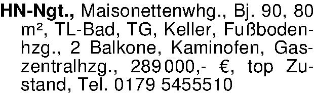 Anzeigentitel: HN-Ngt., Maisonettenwhg., Bj. 90, 80 m², TL-Bad, TG, Keller, Fuß