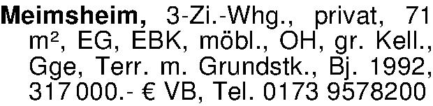 Anzeigentitel: Meimsheim, 3-Zi.-Whg., privat, 71 m², EG, EBK, möbl., OH, gr. Ke