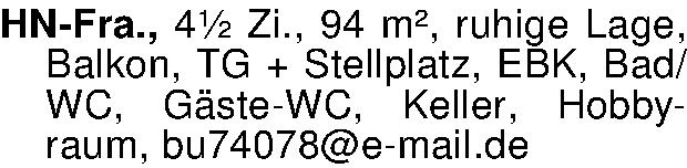 Anzeigentitel: HN-Fra., 4 1/2 Zi., 94 m², ruhige Lage, Balkon, TG + Stellplatz,