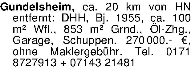 Anzeigentitel: Gundelsheim, ca. 20 km von HN entfernt: DHH, Bj. 1955, ca. 100 m