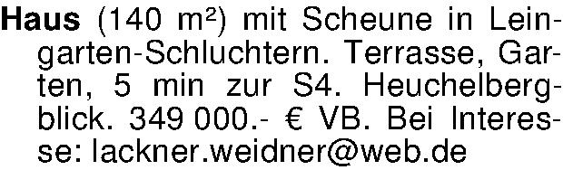 Anzeigentitel: Haus (140qm) mit Scheune in Leingarten-Schluchtern. Terrasse, Ga