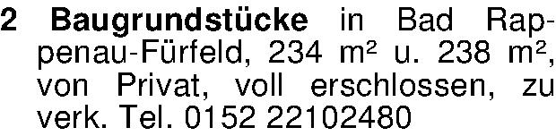 2 Baugrundstücke in Bad Rappenau-Fürfeld, 234 m² u. 238 m², von Privat, voll erschlossen, zu verk. Tel. 0152 22102480