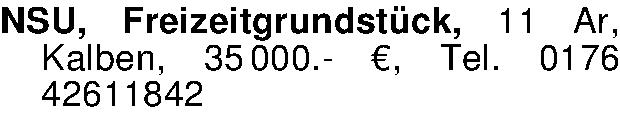 Anzeigentitel: NSU, Freizeitgrundstück, 11 Ar, Kalben, 35 000.- €, Tel. 0176 42
