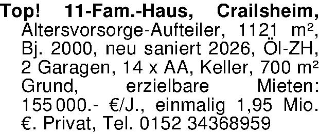 Anzeigentitel: Top! 11-Fam.-Haus, Crailsheim, Altersvorsorge-Aufteiler, 1121 m