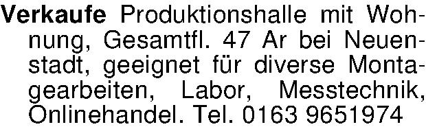Anzeigentitel: Verk. Produktionshalle mit Whg., Gesamtfl. 47ar bei Neuenstadt.