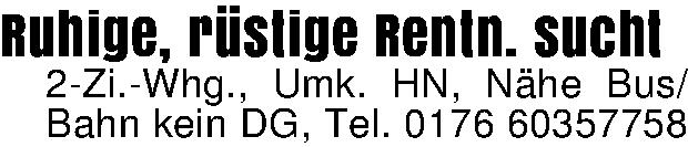 Anzeigentitel: Ruhige, rüstige Rentn. sucht2-Zi.-Whg., Umk. HN, Nähe Bus/Bahn k