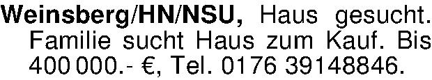 Anzeigentitel: Weinsberg/HN/NSU, Haus gesucht. Familie sucht Haus zum Kauf. Bis