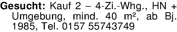 Gesucht: Kauf 2 – 4-Zi.-Whg., HN + Umgebung, mind. 40 m², ab Bj. 1985, Tel. 0157 55743749