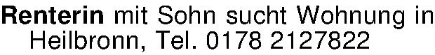 Anzeigentitel: Renterin mit Sohn sucht Wohnung in Heilbronn, Tel. 0178 2127822