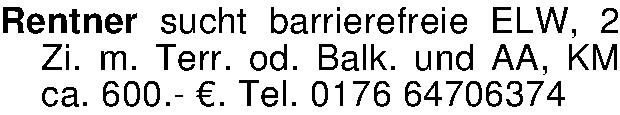 Rentner sucht barrierefreie ELW, 2 Zi. m. Terr. od. Balk. und AA, KM ca. 600.- €. Tel. 0176 64706374