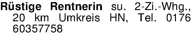 Anzeigentitel: Rüstige Rentnerin su. 2-Zi.-Whg., 20 km Umkreis HN, Tel. 0176 60