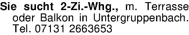 Sie sucht 2-Zi.-Whg., m. Terrasse oder Balkon in Untergruppenbach. Tel. 07131 2663653