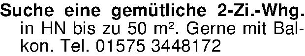 Suche eine gemütliche 2-Zi.-Whg. in HN bis zu 50 m². Gerne mit Balkon. Tel. 01575 3448172