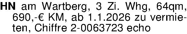 HN am Wartberg, 3 Zi. Whg, 64qm, 690,-€ KM, ab 1.1.2026 zu vermieten, Chiffre 2-0063723 echo