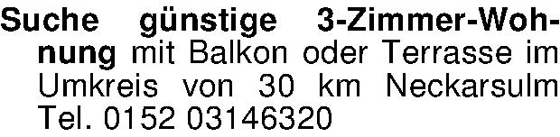 Suche günstige 3-Zimmer-Wohnung mit Balkon oder Terrasse im Umkreis von 30 km Neckarsulm Tel. 0152 03146320