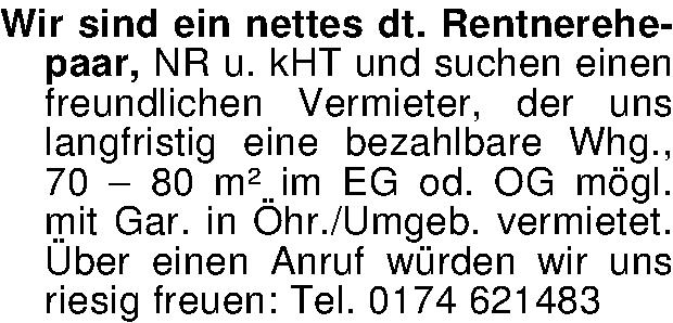 Wir sind ein nettes dt. Rentnerehepaar, NR u. kHT und suchen einen freundlichen Vermieter, der uns langfristig eine bezahlbare Whg., 70 – 80 m² im EG od. OG mögl. mit Gar. in Öhr./Umgeb. vermietet. Über einen Anruf würden wir uns riesig freuen: Tel. 0174 621483