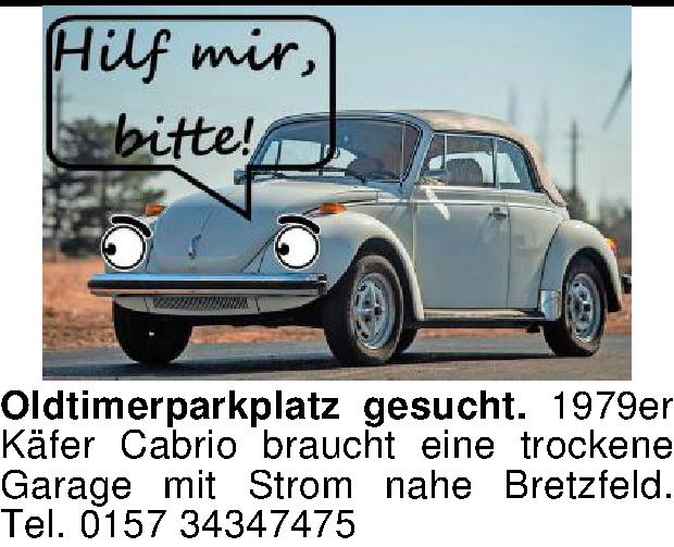 Oldtimerparkplatz gesucht. 1979er Käfer Cabrio braucht eine trockene Garage mit Strom nahe Bretzfeld. Tel. 0157 34347475