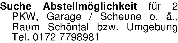 Suche Abstellmöglichkeit für 2 PKW, Garage / Scheune o. ä., Raum Schöntal bzw. Umgebung Tel. 0172 7798981