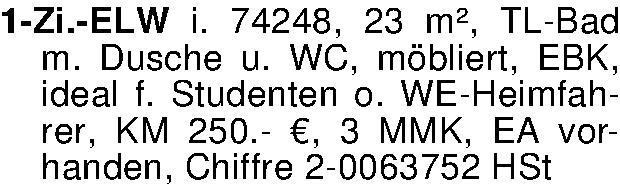 1-Zi.-ELW i. 74248, 23 m², TL-Bad m. Dusche u. WC, möbliert, EBK, ideal f. Studenten o. WE-Heimfahrer, KM 250.- €, 3 MMK, EA vorhanden, Chiffre 2-0063752 HSt