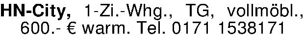 Anzeigentitel: HN-City, 1-Zi.-Whg., TG, vollmöbl., 600.- € warm. Tel. 0171 1538