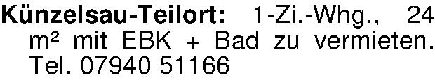Künzelsau-Teilort: 1-Zi.-Whg., 24 m² mit EBK + Bad zu vermieten. Tel. 07940 51166