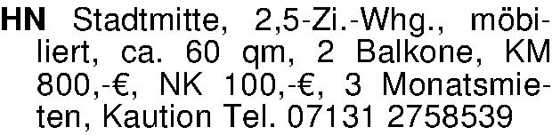 Anzeigentitel: HN Stadtmitte, 2,5-Zi.-Whg., möbiliert, ca. 60 qm, 2 Balkone, KM