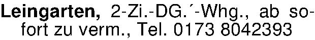 Anzeigentitel: Leingarten, 2-Zi.-DG.'-Whg., ab sofort zu verm., Tel. 0173 80423