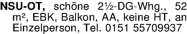 NSU-OT, schöne 2½-DG-Whg., 52 m², EBK, Balkon, AA, keine HT, an Einzelperson, Tel. 0151 55709937