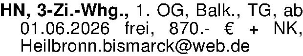 HN, 3-Zi.-Whg., 1. OG, Balk., TG, ab 01.06.2026 frei, 870.- € + NK, ­Heilbronn.bismarck@web.de
