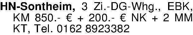 Anzeigentitel: HN-Sontheim, 3 Zi.-DG-Whg., EBK, KM 850.- € + 200.- € NK + 2 MM