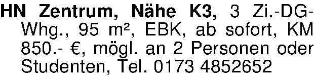 Anzeigentitel: HN Zentrum, Nähe K3, 3 Zi.-DG-Whg., 95 m², EBK, ab sofort, KM 85